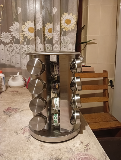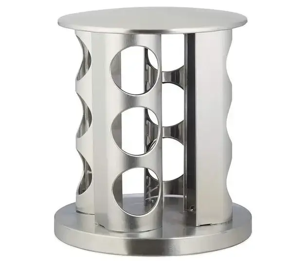 Зручність, компактність і сучасний дизайнНабір карусель із 12 скляних баночок для спецій на обертовій підставці з нержавіючої сталі. Вони щільно закриваються, зберігаючи аромат та смак ваших приправ. Прозорі стінки дозволяють швидко знайти потрібну спецію, а сучасний дизайн прикрасить будь-яку кухню.
